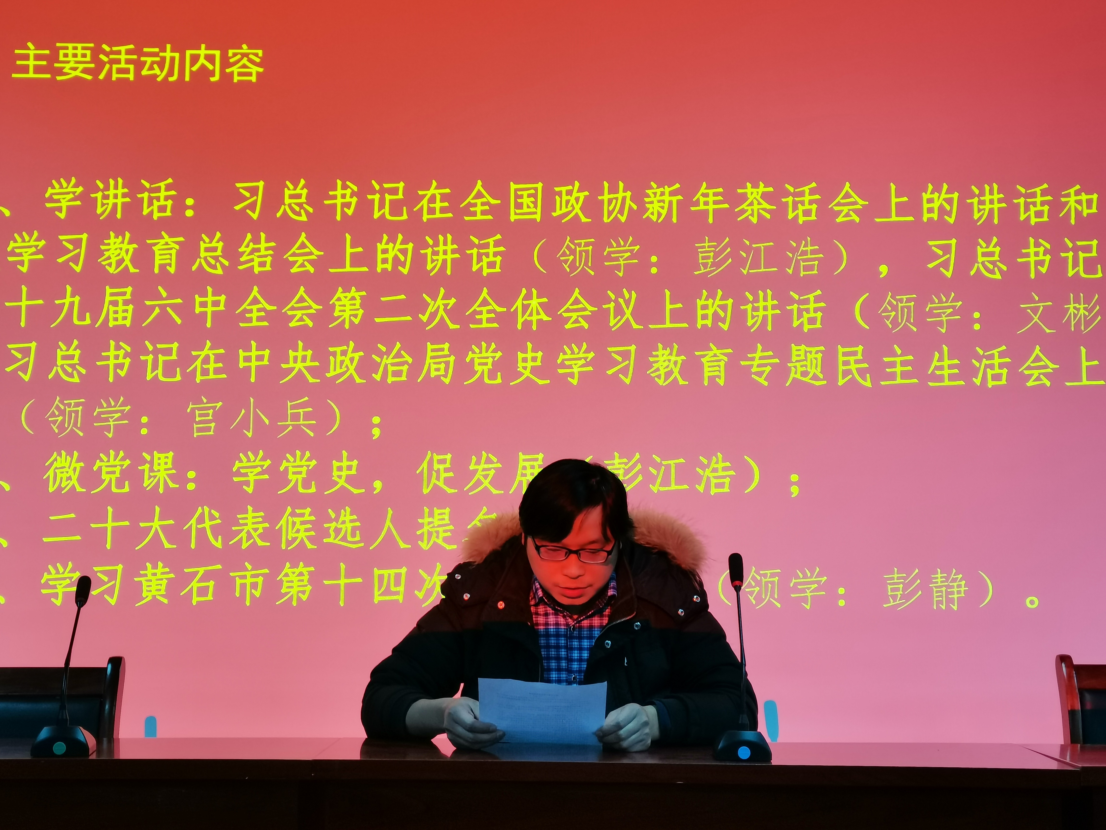 活动的最后一项,由教师二支部书记彭静领学了黄石市第十四次党代会报告。