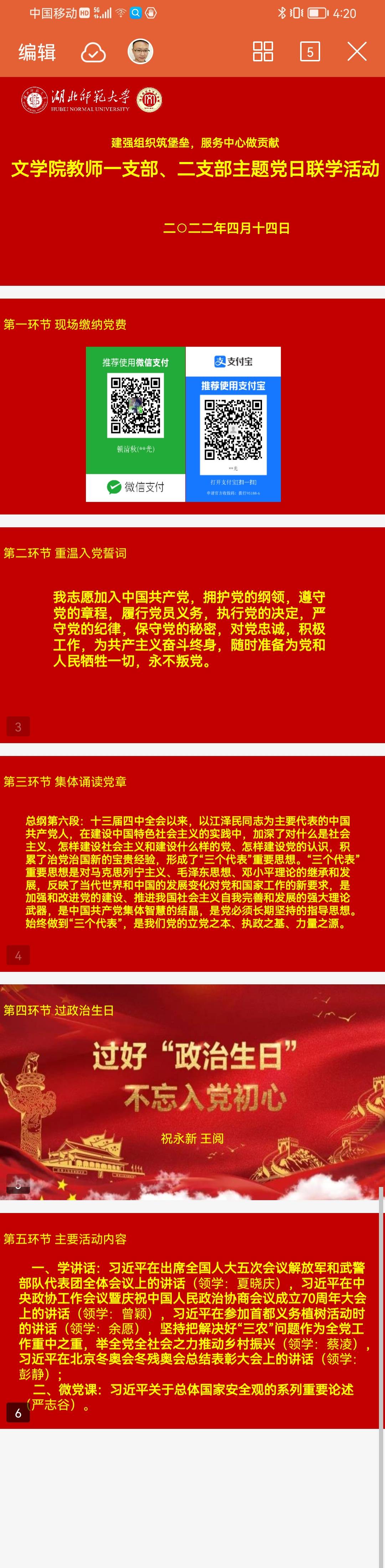 活动伊始,全体党员重温入党誓词、集体诵读党章、缴纳4月党费。接下来,4月过“政治生日”的祝永新同志和王阅同志发表了感想。祝永新提到他在工作和生活中见义勇为、乐于助人的优秀事迹;王阅总结了近年的生活和工作经历,她提到党的伟大精神和光荣传统是我们的宝贵精神财富、是激励我们奋勇前进的强大精神动力,我们党历经百年沧桑依然风华正茂,其奥秘就在于具有自我净化、自我完善、自我革新、自我提高的强大能力,自我革命精神是党的执政能力的强大支撑。紧接着教师一支部党政办和教学科研办党小组的夏晓庆、曾颖、余愿、蔡凌四位同志分别领学了《习近平在出席全国人大五次会议解放军和武警部队代表团全体会议上的讲话》、《习近平在中央政协工作会议暨庆祝中国人民政治协商会议成立70周年大会上的讲话》、《习近平在参加首都义务植树活动时的讲话》、《坚持把解决好“三农”问题作为全党工作重中之重,举全党全社会之力推动乡村振兴》, 教师二支部书记彭静也领学了《习近平在北京冬奥会冬残奥会总结表彰大会上的讲话》。