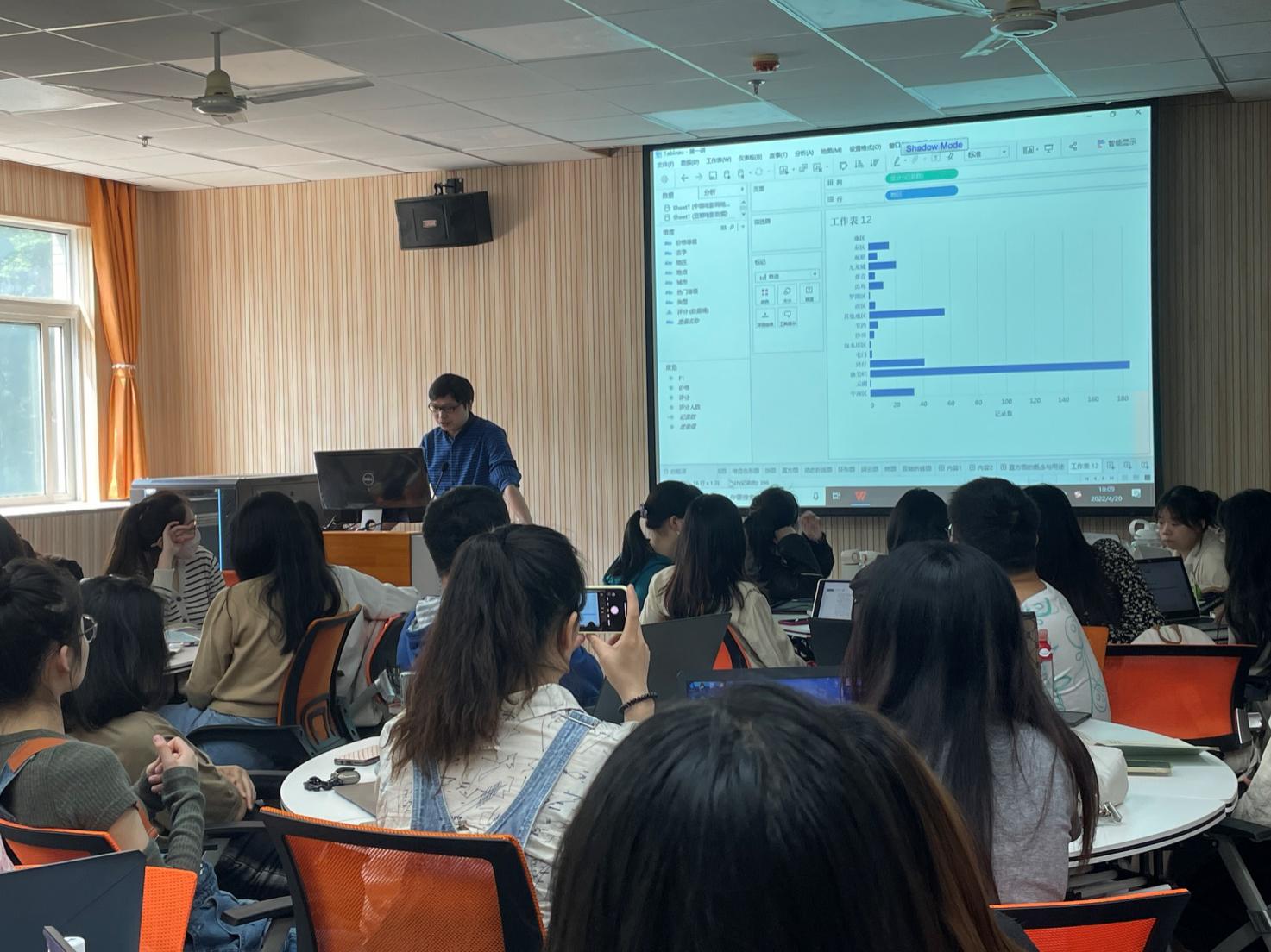 在实操课上,彭静首先对维度、度量、拆线图、堆叠条形图及颜色设置等内容进行了详细的介绍,演示了利用现有数据文件建柱状图和利用豆瓣电影数据做拆线图,并引导学生积极开展课堂实践。彭老师授课理论讲解与实践相结合,张驰有度,节奏合理。