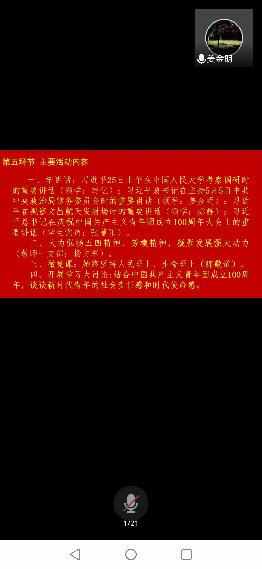 本次学讲话环节由传播学教研室负责:赵亿同志领学习近平4月25日上午在中国人民大学考察调研时的重要讲话;姜金明同志领学习近平总书记在主持5月5日中共中央政治局常务委员会时的重要讲话;彭静同志领学习近平在视察文昌航天发射场时的重要讲话。学生党员张曹阳同志随后也领学习近平总书记在庆祝中国共产主义青年团成立100周年大会上的重要讲话。