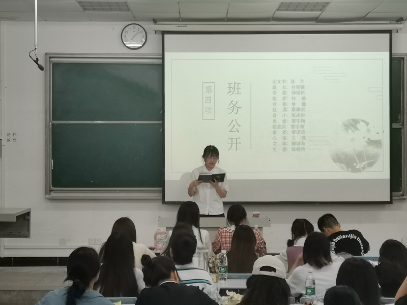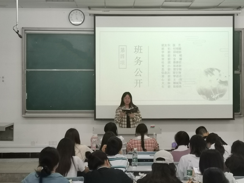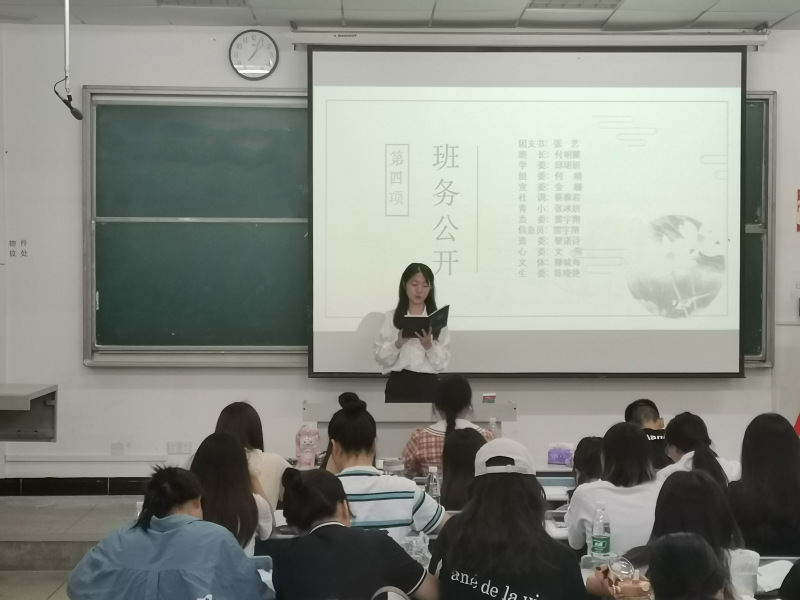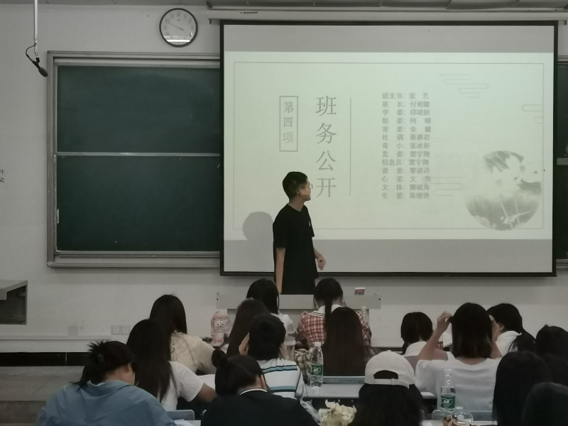 班务公开环节,班委会成员依次上台发言,汇报了近一年的工作状况,从工作说明、工作成就和自我批评三个方面展现了班级的成就与进取的面貌。