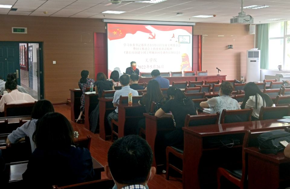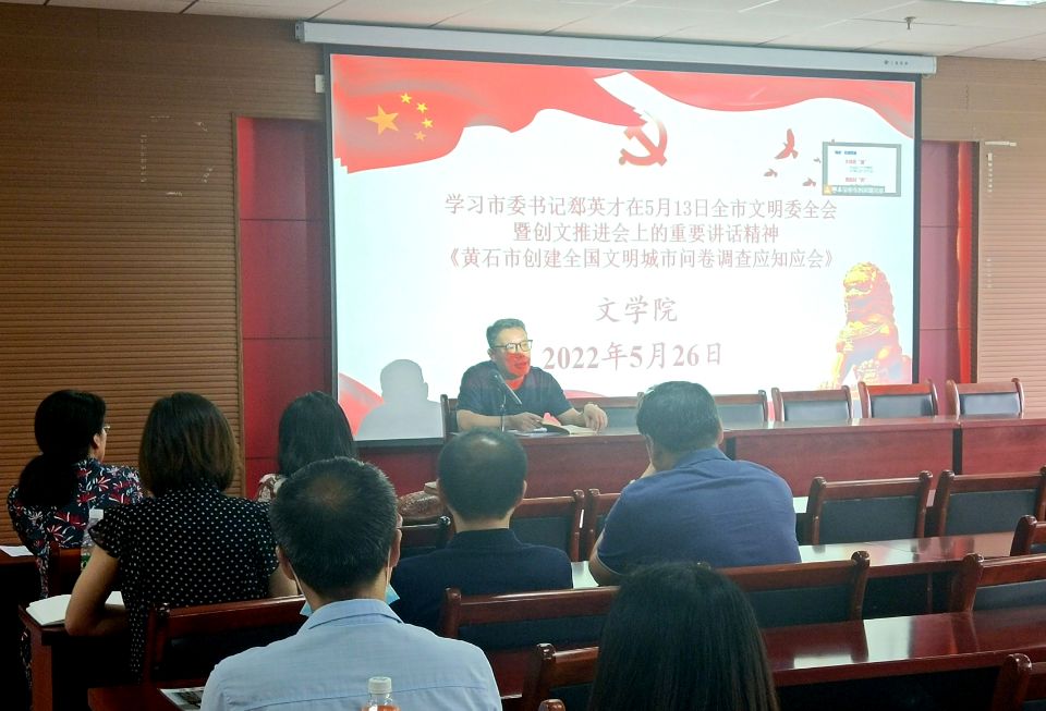 2022年5月26日下午,yl9193永利集团在人文楼A-602召开全院教职工大会专题学习黄石市委书记郄英才于13日“黄石市委文明委全会暨创文推进会”上的讲话精神。学院党委书记严志谷主持会议并领学精神、安排工作。