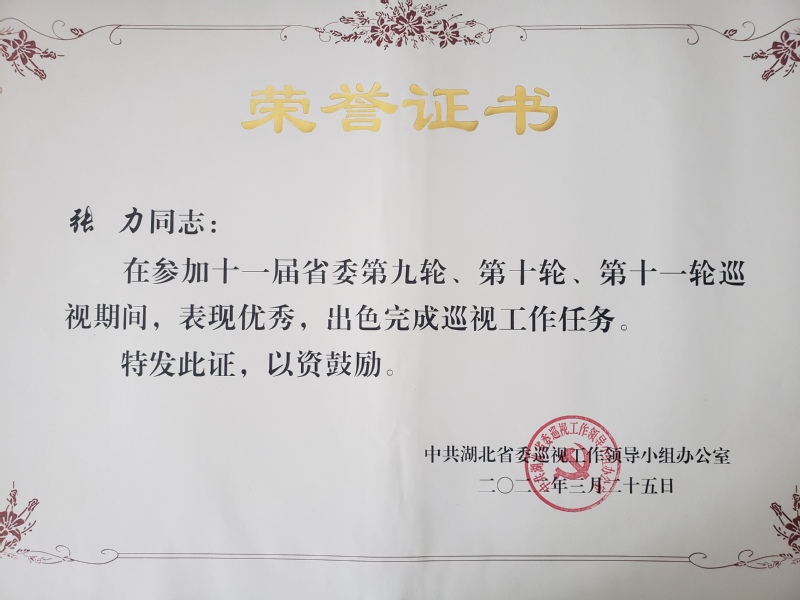 2021年6月至2021年12月,根据工作需要,yl9193永利集团辅导员张力被抽调到省委第二巡视组,参加了十一届省委第九轮、第十轮和第十一轮巡视工作。因巡视期间工作表现突出,近日,由中共湖北省委巡视工作领导小组办公室、中共湖北省委第二巡视组为其授予荣誉证书,以资鼓励。