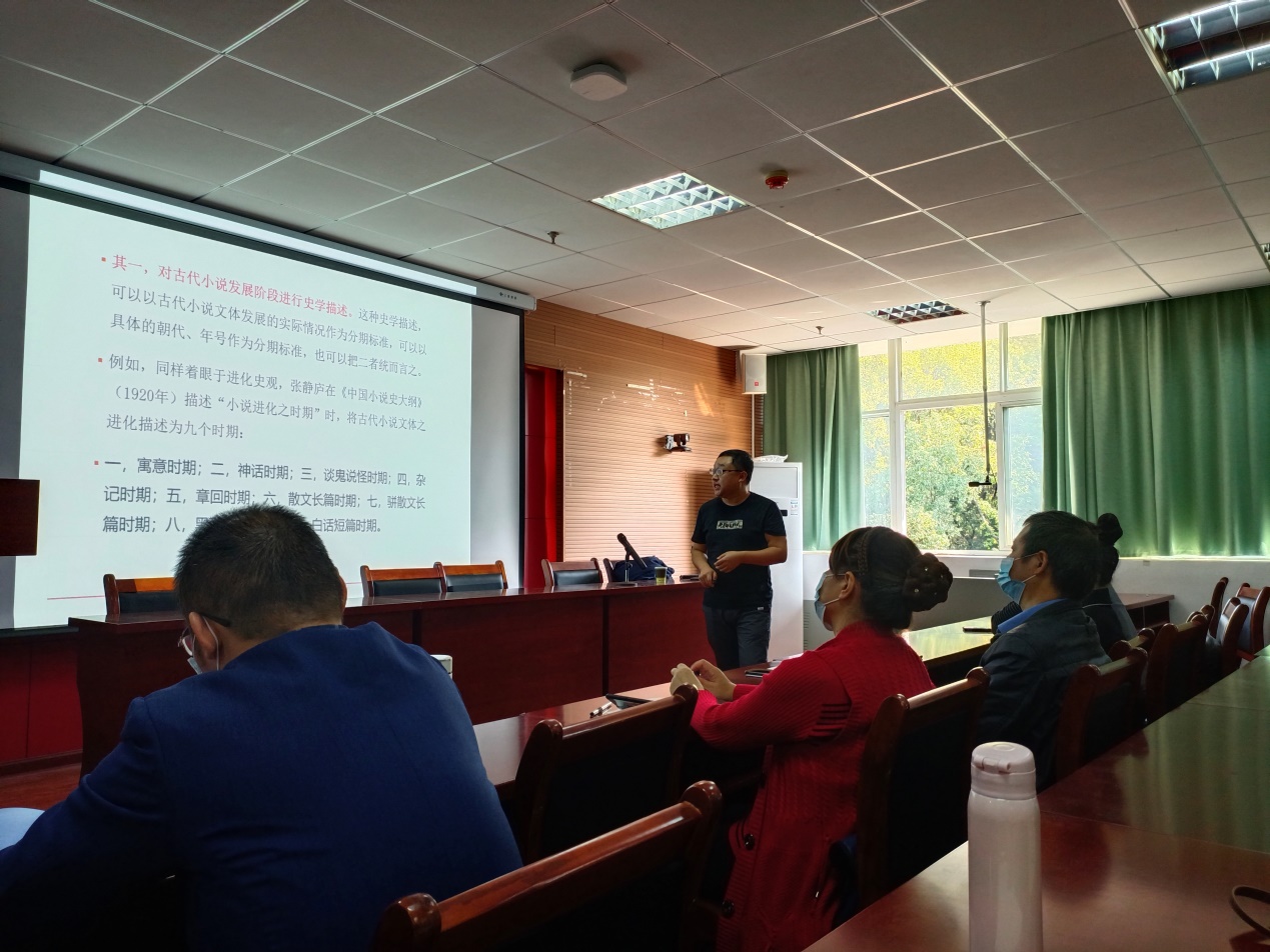 景遐东简要介绍了李春光博士的研究方向和此次报告的主题。报告中,李春光首先指出对文学史的研究离不开史观,讲述了民国以来小说史观的发展过程,提出阅读一本小说史的三个维度“描述、解释、评价”。接下来从这三个维度,展开具体的分析和论证:第一,理性地把握历史发展进程,是一切史书存在的第一要义。我国历代学者基于不同的发展观对古代小说发展阶段、发展节点、发展要素有不同的描述。第二,基于不同的小说生态观,针对古代小说现象形成原因、小说作品的甄别取舍、小说主题理解差异,各小说史研究学者也存在不同见解。第三,文学史观的落脚点应该在评价上,要对古代小说的认识价值、审美价值、文体价值进行客观全面的评价。除此之外,李春光还着重强调,研究生在写论文时要将“文学生态”坐实,不能泛泛空谈,必须将作品放置在其所处的历史场景中进行阐述。报告结束,景遐东做总结发言,他指出研究生要注重学习方法、开阔眼界,研究中国古代小说既要利用新的西方理论、也要立足于本国文化传统。