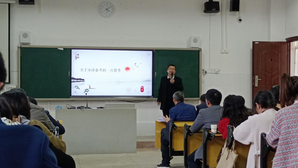 点评结束后,阳新一中特级教师、黄石名师刘杰为我们带来了“关于宋诗备考的一点思考”专题微讲座。他从宋诗真题分类研读、唐宋诗对比析读(真题、课本)、宋诗分类拓展阅读三个内容,讲解了宋诗备考的重要思考角度,为我们打开了宋诗教学设计的新思路。