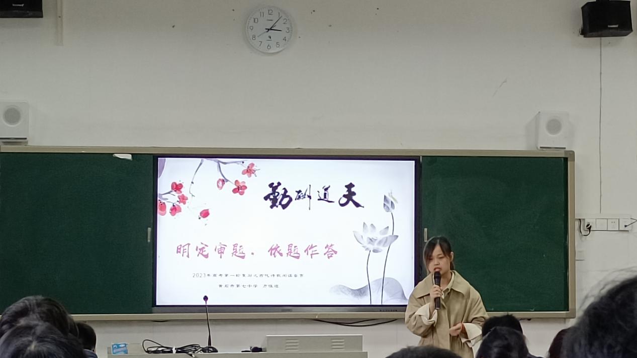 黄石七中方佳煜老师带来《明定审题,依题作答》的公开课,她从高考考察古诗词的基本要求切入,先复习了古诗词的考察知识点、后引导学生调动已有的知识储备,明确题干作答要求,使问题的解决由难变易、化繁为简,层层突破。