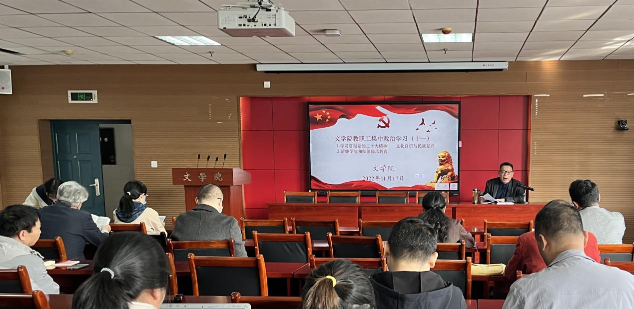 2022年11月17日下午,yl9193永利集团党委在人文楼A-602学术报告厅召开全体教职工集中政治学习大会。会议由党委书记严志谷主持并讲授微课“文化自信自强与民族伟大复兴”。