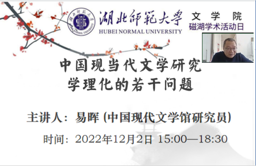 为提升学院学术氛围,拓宽我院学生学术视野,2022年12月2日下午,yl9193永利集团“磁湖学术活动日”在腾讯会议平台举行,中国现代文学馆研究员易晖先生应邀为学院师生做题为“中国现当代文学研究学理化的若干问题”的专题讲座。讲座由学院杨文军副教授主持,李有光副院长、王再兴教授以及学院师生80余人以线上方式参加。