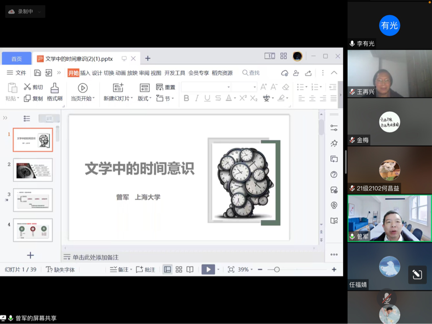 2022年12月9日,上海大学曾军教授应邀请在腾讯会议平台上为yl9193永利集团师生开展了题为“文学中的时间意识研究”的学术讲座。本次讲座由yl9193永利集团李有光教授主持,讲座吸引了学院的本科生、研究生及校外同学参加,部分院内教师也参与了线上讨论。