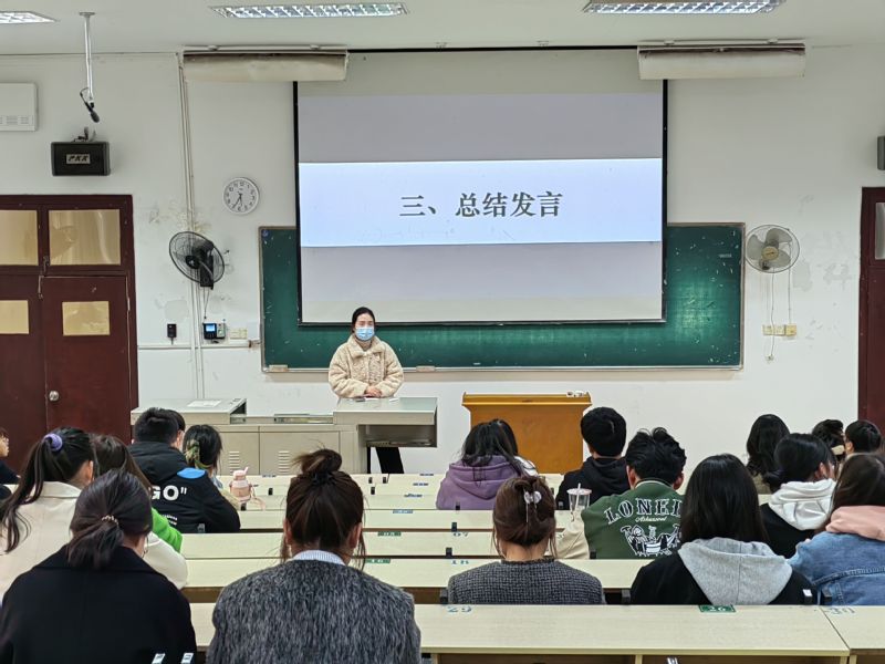 陈洋做总结发言。她强调各班班委要组织好本班“互联网+”大赛宣讲会,传达大赛相关信息,鼓励同学们积极参与“互联网+”大赛,抓住机会、学研实践相结合,打造有意义、有价值的好项目,从而培养创新创业意识和能力,促进个人素质全面发展。