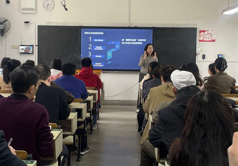 陈欢通过对以往教学知识的回顾,谈及新闻主体的结构方式分类,引出华尔街日报体这一特殊新闻写作的形式,通过大量新闻案例,让学生了解、掌握华尔街日报体的结构特点和写作要求。本次示范课备课充分,教学环节设计流畅;课堂互动强,不断引导学生主动思考;注重运用、实践性,对学生有训练意识。