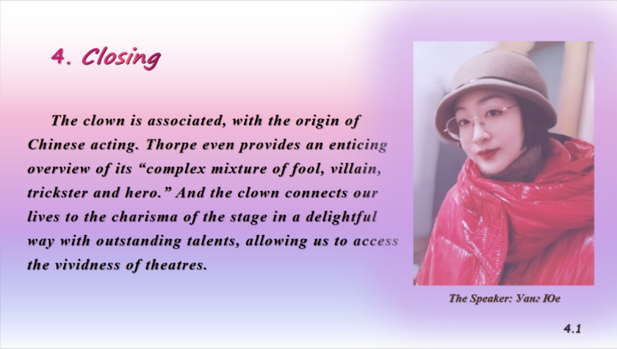 在“无丑不成戏”这一节,王阅认为,关于丑行的早期文献,可以追溯到《史记·滑稽列传》。关于丑角的分类,除了按照习惯分为“文丑”和“武丑”以外,还举例介绍了不同剧种中的不同分类方法,比如川剧中的袍带丑、裙子丑和烟子丑,京剧传统小戏《小放牛》(又名《杏花村》)中的牧童为娃娃丑,昆曲《玉簪记·秋江》中的艄翁为茶衣丑等。在介绍乾隆年间京腔十三绝和清代戏曲人物画家沈蓉圃的画作《同光十三绝》中的丑角刘赶三和杨鸣玉的同时,王阅也着重介绍了梅兰芳的祖父梅巧玲在画作《同光十三绝》的舞台形象——《雁门关》中的萧太后。在结语部分,王阅针对Ashley Thorpe对丑角的印象:“丑角是一种充满幽默机趣的英雄形象”,提出丑行与戏曲表演的源头紧密相关,丑角演员以高超的艺术才华将我们的真实生活与生机盎然的舞台联结起来,让我们感知到中国戏曲的生动气韵与无限魅力。与会学者在互动环节和王阅进行了深入交流,显现出对楚文化的浓厚兴趣。