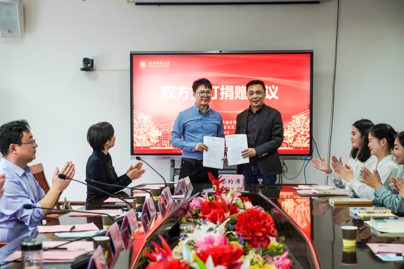 刘洋代表学校和何贞发签订《捐赠协议》。