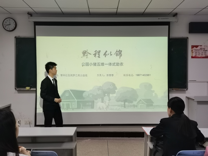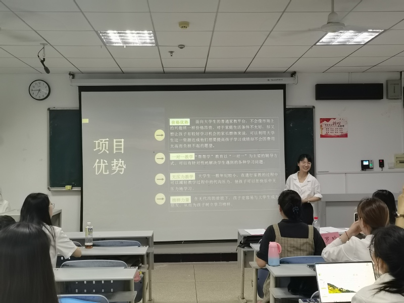 活动伊始,由主持人介绍路演规则后,每个项目负责人依次上台宣讲,结合PPT围绕市场背景、项目概况、财务分析、风险评估等方面对项目进行具体阐述,并接受评委提问。各项目成员准备充分、精神饱满、发挥稳定,对评委提出的针对项目创新性与商业性的问题做出了明确且细致的解答,得到了评委的认可。各项目负责人在演讲时紧密结合PPT,游刃有余地完成了项目宣讲,其中“萌宠解忧——培养动物治愈患者”项目,希望从国外引进更多的导盲犬从而为国内的残障人士服务,为国内的公益事业做出更多贡献;“殷祖白茶”项目将目光聚焦于大冶的白茶,希望将本地物美价廉的优质白茶通过互联网推广到全国各地,从而促进本地茶叶行业发展。