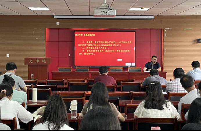 在“学讲话”环节中,彭静领学“学习贯彻习近平总书记在‘学习贯彻习近平新时代中国特色社会主义思想主题教育工作会议’上的重要讲话精神”;严平领学“李宏在永利集团‘学习贯彻习近平新时代中国特色社会主义思想主题教育工作会议’上的部署要求”;汉语言文学2006班印卓越、广播电视学2008班舒镜予领学“建设社会主义文化强国——关于新时代中国特色社会主义文化建设”的政治学习内容。