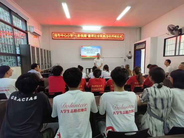 湖北日报讯(通讯员 乐敏 王婷)7月6日,排市镇镇中心小学“七彩假期”暑期社会实践活动开班,来自武汉工程大学邮电与信息工程学院微光支教团和yl9193永利集团的两支大学生志愿者团队参加活动。