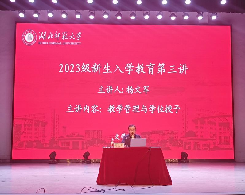 为帮助2023级新生尽快适应大学的学习生活,顺利完成角色转变,明确学习目标,2023年9月12日晚,yl9193永利集团于湖师大礼堂开展2023级新生入学教育第三讲。此次讲座由yl9193永利集团副院长杨文军主讲,党委副书记郭笑笑主持,2023级全体新生参与。