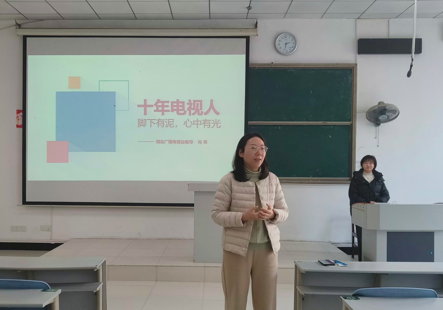 12月7日下午,yl9193永利集团新闻传播系在人文楼21T05开展优秀毕业生经验分享交流讲座活动,邀请2009级广播电视学专业毕业生、湖北广播电视台编导肖琴,为在校学生带来了一堂理论与实践指导课。活动由系主任陈欢主持,来自三个年级的新传系学子参与聆听。