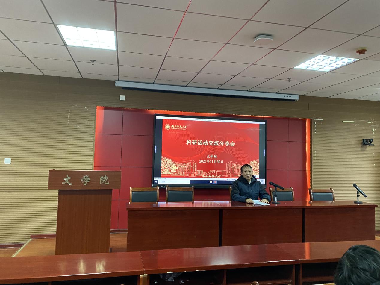 王守雪教授分享了其参加的湖北省文艺学学会第十九届年会暨首届两湖论坛情况。此次年会由湖北省文艺学会主办,于2023年11月24—26日在湖北科技学院召开。此次会议的主题是“中国文论话语体系建设”。我院李有光教授和王守雪教授分别作题为“阐释学视域下的中国诗话批判性阐释方法研究”和“刘勰对诗之“六义”的解释策略及传承发展”的大会报告和分会报告。王守雪教授鼓励老师们多参加学术交流活动,加强与同行的联系,不断提升自身科研水平和我校学术影响力。