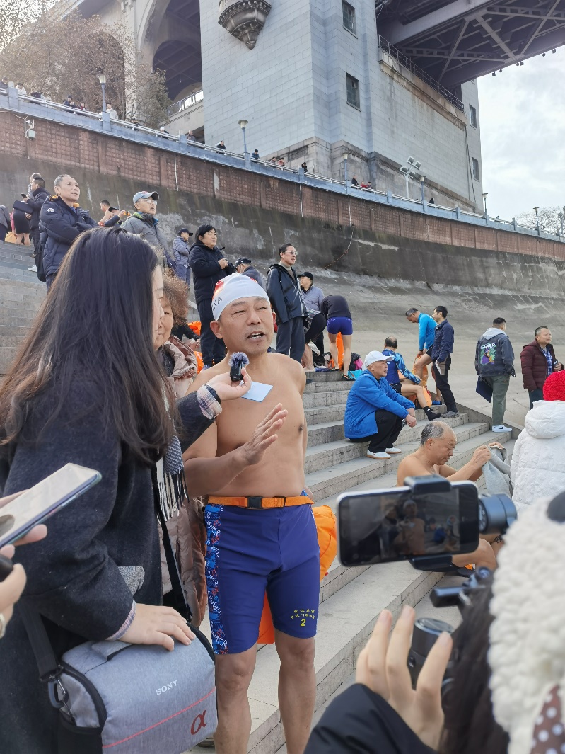 上午9时左右,工作室成员们来到活动起点,分为文字、摄像、采访等小组进行活动记录。成员们拍摄运动员们热身合影的场景,并针对不同年龄段、不同职业身份运动员进行采访,了解运动员们的冬泳经历和对冬泳的看法,参加本次冬泳活动的原因,以及对于活动的期待等。活动开始约50分钟后,成员们来到对岸等待运动员们登岸,对运动员们的感受以及在本次冬泳中的收获进行采访。11时本次活动圆满结束。工作室成员们整理资料,对受访者进行回访,产出文字和视频稿件,并在微信公众号和抖音平台发布作品。