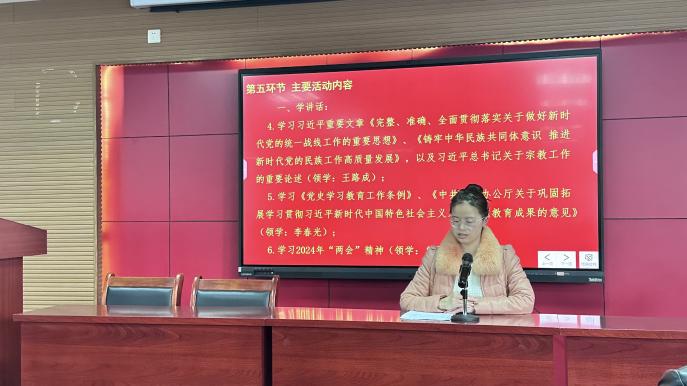 本次“主题党日”的学讲话环节,首先由王路成同志领学《完整、准确、全面贯彻落实关于做好新时代党的统一战线工作的重要思想》《铸牢中华民族共同体意识 推进新时代党的民族工作高质量发展》以及习近平总书记关于宗教工作的重要论述;其次由李春光同志领学《党史学习教育工作条例》《中共中央办公厅关于巩固拓展学习贯彻习近平新时代中国特色社会主义思想主题教育成果的意见》;曾羽霞同志领学2024年“两会”精神。三位同志分别结合领学内容,谈了各自学习的心得体会。