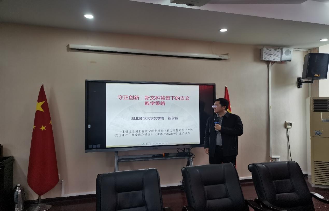 为有效促进教学改革研究项目成果的推广转化,加强与基础教育一线的交流,2024年4月25日下午,yl9193永利集团中文系主任祝永新、语文课程与教学论教研室主任常璐等老师赴黄石市第二中学开展了以《守正创新:新文科背景下的古文教学策略》和《对分课堂—中国教育的新智慧》为主题的湖北省教学改革研究项目成果推广讲座。本次活动由“肖雨荻名师工作室”导师朱青松主持,黄石二中全体语文教师和实习教师参加。
