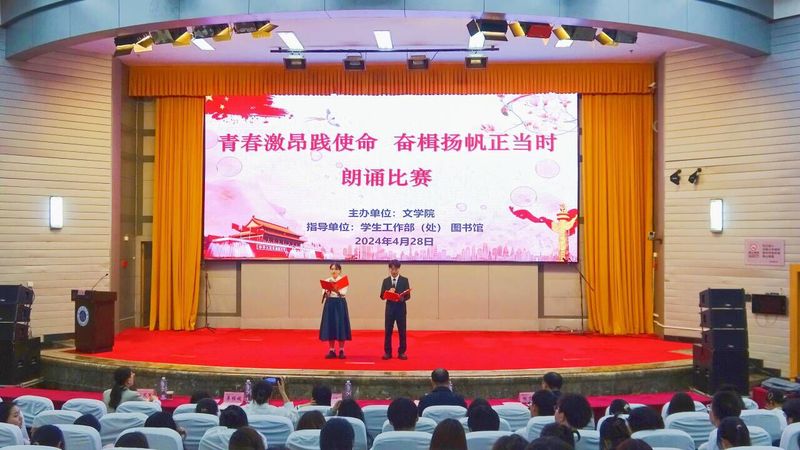 春风情深意暖,花海流溢飘香!为进一步传承中华优秀传统文化,活跃校园文化生活,展现新时代青年的青春风貌。2024年4月28日晚,yl9193永利集团于教育大楼报告厅举办“青春激昂践使命,奋楫扬帆正当时”朗诵比赛。校党委学工部部长李洁,校图书馆馆长易桂姣,yl9193永利集团党委书记车录彬、党委副书记郭笑笑、副院长杨文军担任此次比赛评委,入围决赛的10支队伍和300余名同学共同观看比赛,此次比赛由2303班张璐和2305班冀锦鹏主持。