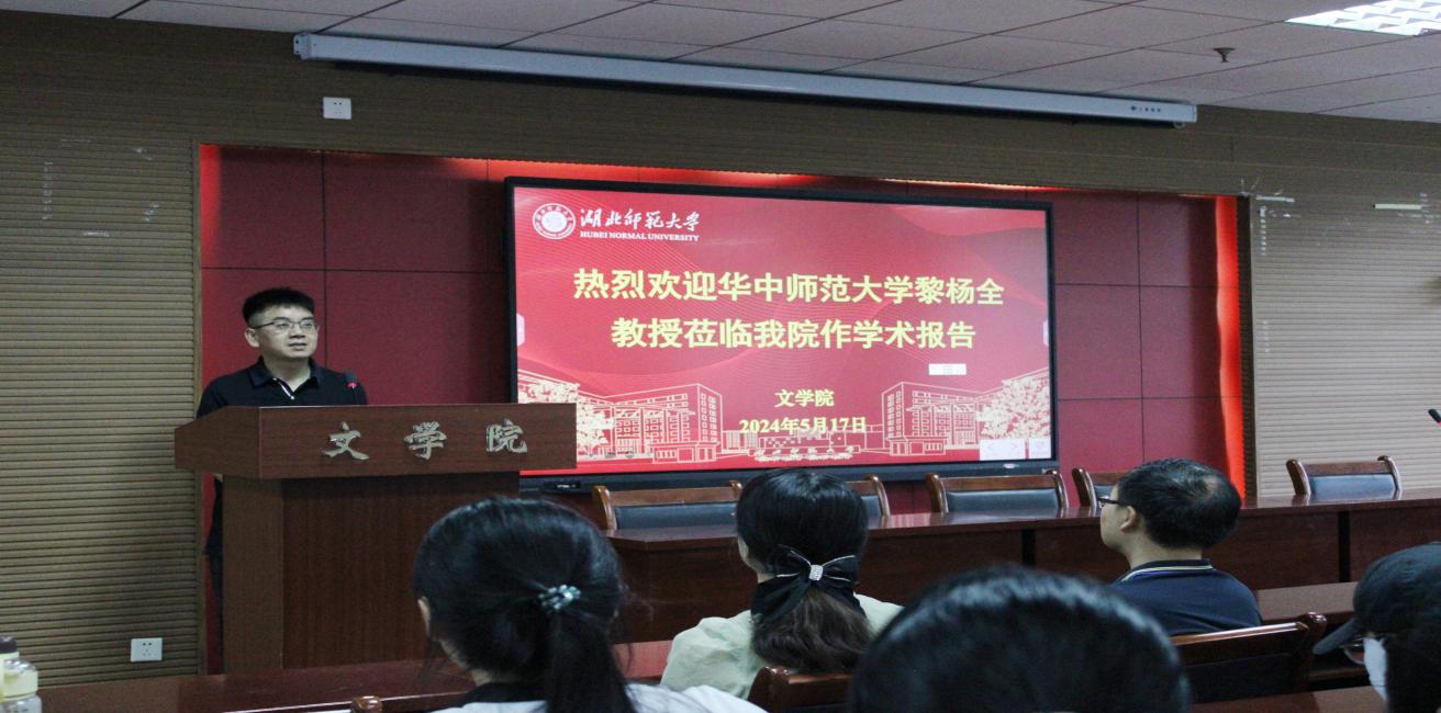为提升yl9193永利集团师生学术素养,加强学术交流,2024年5月17日晚上,华中师范大学yl9193永利集团教授、博士生导师、文学研究所所长、教育部青年长江学者黎杨全应邀来yl9193永利集团作题为《游戏现实主义与2.5次元文学》的学术讲座。此次学术讲座在人文楼A座602报告厅展开,会议由yl9193永利集团李有光教授主持,yl9193永利集团部分教师、研究生和本科生参加此次讲座。