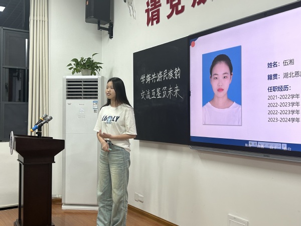 少数民族优秀学生代表,2105班伍湘向大家分享在校期间学习和生活等方面的经验,她鼓励学弟学妹们努力学习理论知识,结合自身特长提升自己,勇于实践,大学期间不要害怕失败,并对学校、老师和同学们在校期间给予她的关心和帮助表示感谢。