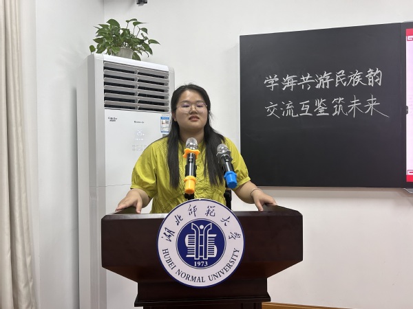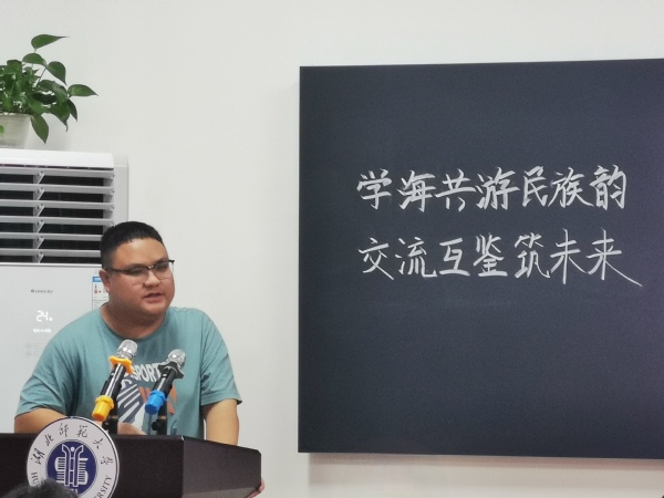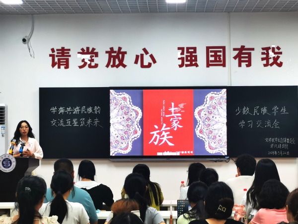 交流会上,2108班黄昊、2303班陈明明和2304班黄丽萍三位少数民族代表,结合精心准备的多媒体课件向大家讲述了苗族的发源、土家族的特色服饰、油茶汤等传统美食以及盘瑶嫁郎的瑶族风俗等。