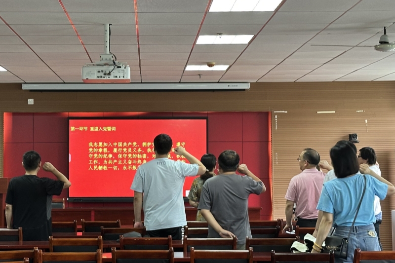 党员同志首先重温入党誓词、缴纳7月份党费、并在彭静同志的带领下集体诵读党章总纲第29段。
