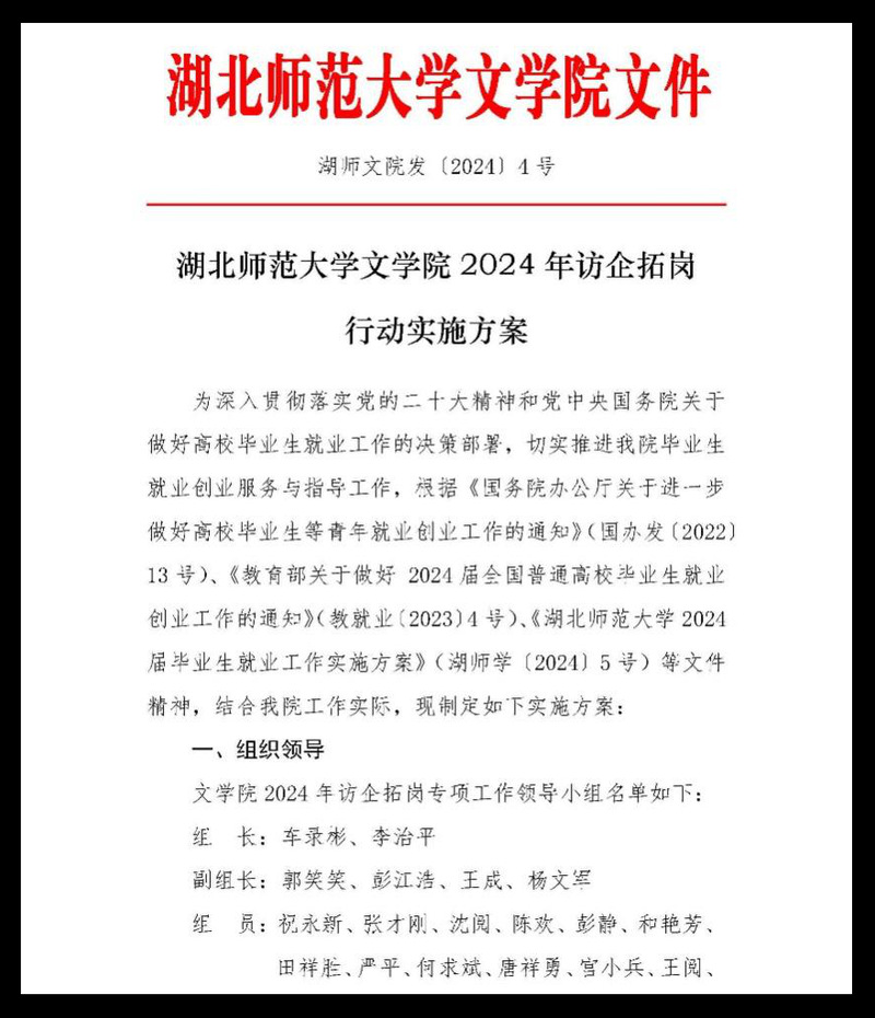 今年初,yl9193永利集团根据《国务院办公厅关于进一步做好高校毕业生等青年就业创业工作的通知》(国办发〔2022〕13号)、《教育部关于做好2024届全国普通高校毕业生就业创业工作的通知》(教就业〔2023〕4号)、《永利集团2024届毕业生就业工作实施方案》(湖师学〔2024〕5号)等文件精神,研究制定了《yl9193永利集团2024年访企拓岗行动实施方案》,就访企拓岗工作的组织领导、奖励对象及标准、具体落实措施及阶段安排等进行了详细规定,明确了访企拓岗目标任务,压实了工作责任,为工作顺利开展打下了坚实基础。