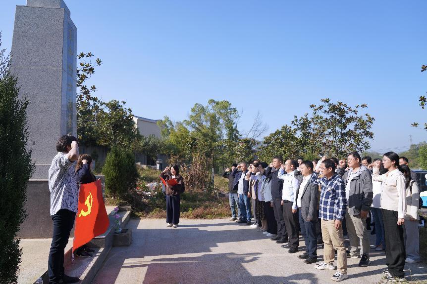 大家首先前往张畈村红色广场,瞻仰革命先烈,追思英雄丰功伟绩。在秦乔楠老师领誓下,全体党员同志面对党旗,举起右拳,重温入党誓词,铿锵有力的宣誓响彻红色广场。全体党员同志认真学习了叶会来、叶会才、叶龙等英雄人物的先进事迹,接受思想上的洗礼。其后,全体党员开展“助力张畈村环境整治义务劳动”主题实践活动,在红色广场打扫卫生,清洁环境。