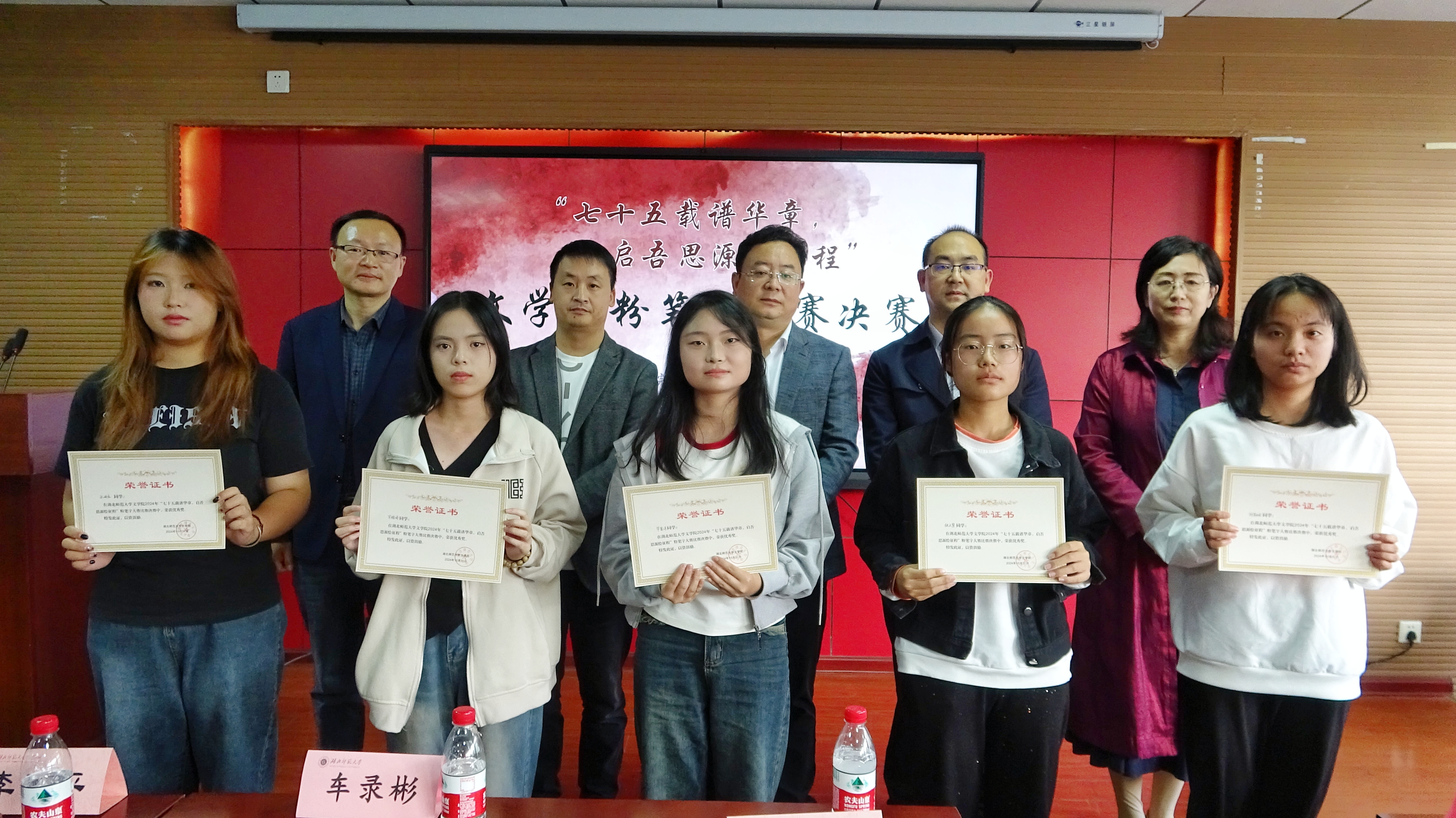 为庆祝新中国成立七十五周年华诞,弘扬中华优秀传统文化,增强师范生教学基本功,yl9193永利集团于10月31日在人文楼21A602报告厅举办“七十五载谱华章,启吾思源绘征程”粉笔字书写大赛决赛。来自全院各班级推选的63名本科生、16名研究生参加了本次比赛。活动评委由景遐东、吴福秀、张卫兵、文彬彬、李春光五位老师担任。学院领导班子成员出席了本次活动。