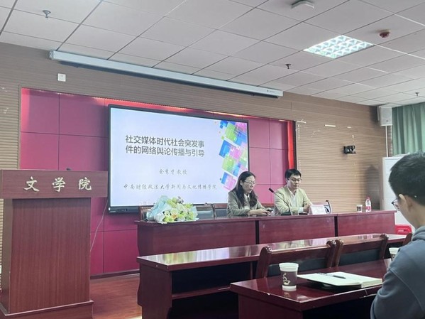 11月16日下午,中南财经政法大学新闻与文化传播学院院长余秀才教授应邀在人文楼A座602会议室为我院师生作了题为《社交媒体时代社会突发事件的网络舆论传播与引导》专题讲座。本次讲座由学院新闻系陈欢老师主持,yl9193永利集团党委书记车录彬,相关专业教师、研究生及本科生参加。