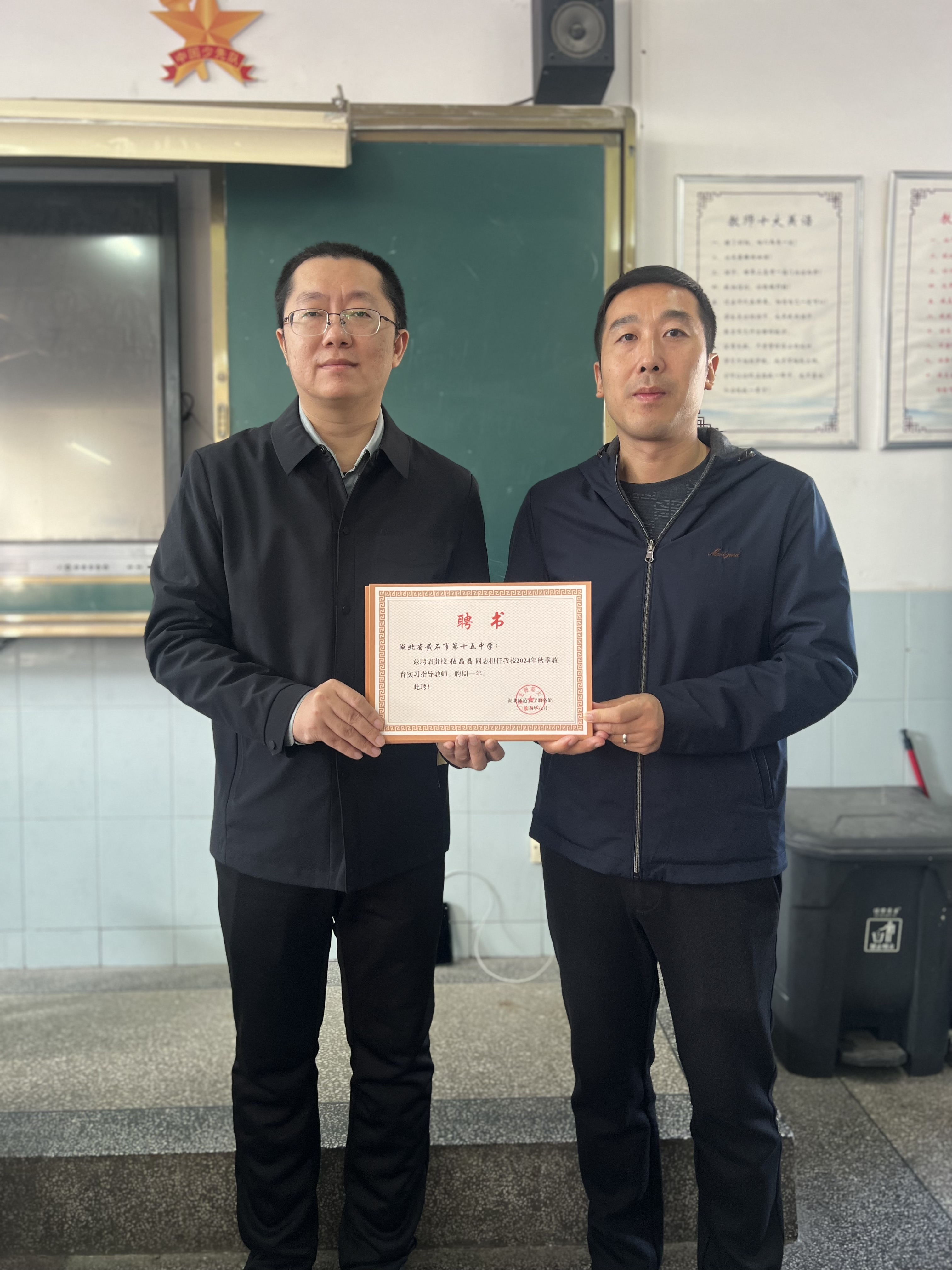 为落实教务处关于2025届师范生教育实习检查工作的要求,确保实习工作有序开展,yl9193永利集团中文系主任祝永新,外国文学教研室主任宫小兵和教师文彬彬,大学语文与写作教研室教师胡婷婷组成教育实习检查工作小组,代表学校,于2024年10月24日、10月25日分别赴黄石市第十八中学和黄石市第十五中学看望实习学生,开展实习检查工作,颁发指导教师聘书。