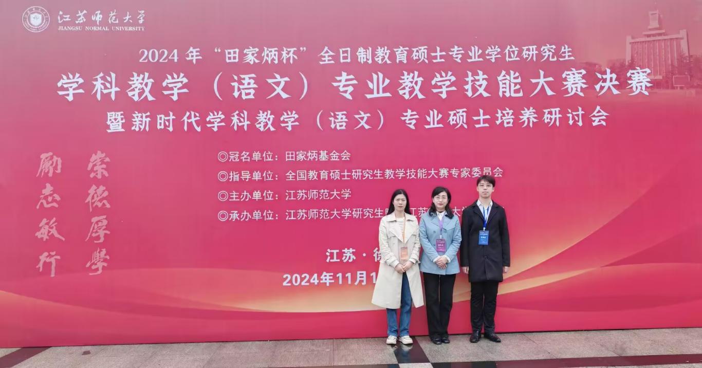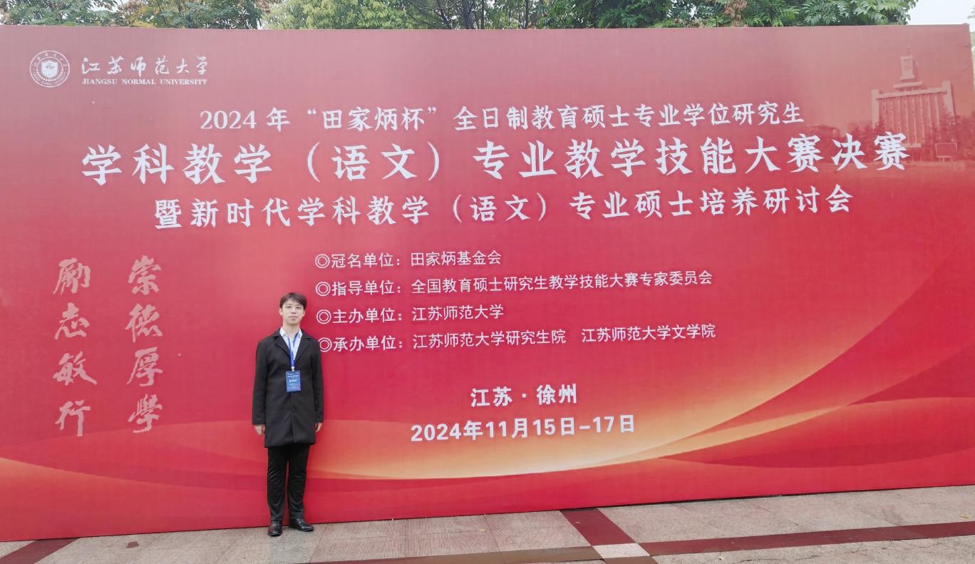 11月15日至17日,2024年全国“田家炳杯”全日制教育硕士专业学位研究生学科教学(语文)专业教学技能大赛决赛暨新时代学科教学(语文)专业硕士人才培养研讨会在江苏师范大学成功举办。yl9193永利集团副院长彭江浩带队参赛,经过激烈角逐,2022级硕士研究生彭扬获得全国二等奖,彭江浩获得优秀指导教师奖。