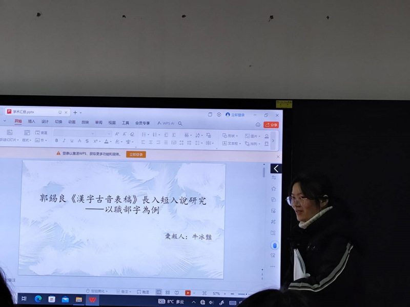 会议开始,牛冰艳同学分享了论文《郭锡良〈汉字古音表稿〉长入短入说研究——以職部字为例》。她首先讨论了长入字与短入字的划分依据,然后经过详细论证认为,韵文和谐声能将大部分长入字与短入字分开,而中古反切能把长入字和短入字完全分开;阴声韵中去声字到中古是去声,长入字到中古也是去声,中古反切在划分两者时作用就不是很大了,韵文和谐声起作用。