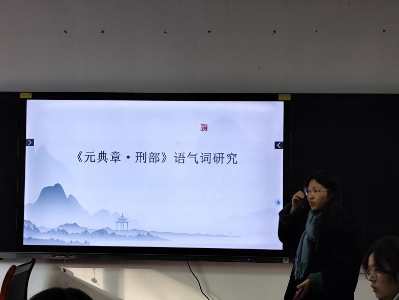 宋俊美同学分享了论文《<元典章•刑部>语气词研究》,主要讨论了《元典章•刑部》一书中语气词“者”“了”“的”“也”“呵”等的历时演变。