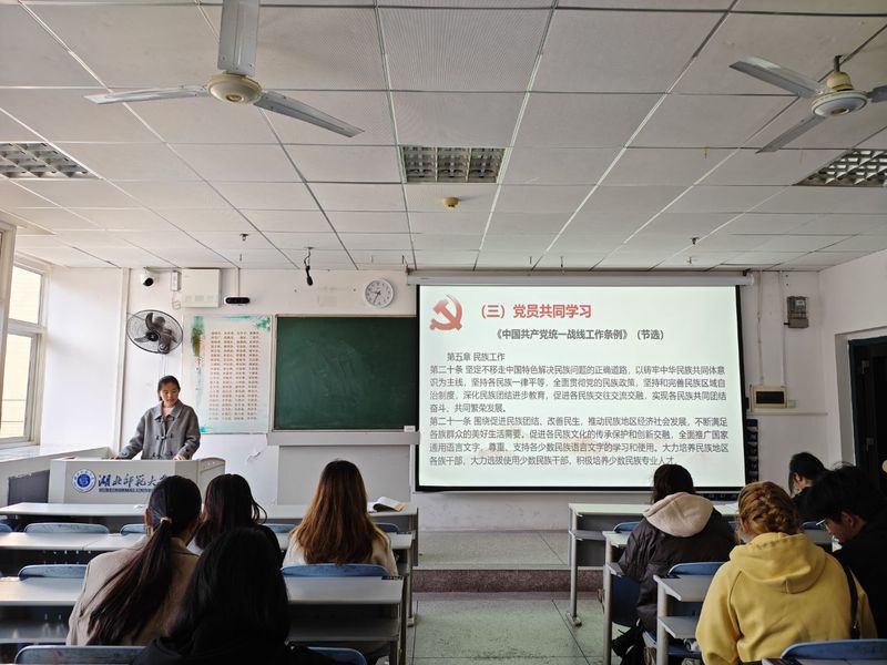 政治理论学习环节,学生党员程玥同志、学生党员彭翡同志、学生党员王颖同志领学“坚定不移走中国特色道路,正确对待民族宗教问题”主题内容。她们指出,作为学生党员,熟悉和掌握党的民族宗教政策,对于加强民族团结、反对民族分裂、认清民族分裂和非法宗教活动危害具有重要性和必要性;要充分理解和掌握这些知识,增强明辨是非的能力和依法运用政策解决民族宗教问题的能力;正确认识与对待民族、宗教问题,强化促进民族平等团结的责任与意识,准确把握宗教信仰自由政策,自觉抵御非法传教活动,为贯彻民族宗教政策做贡献,为全面社会主义现代化建设注入强劲动能。