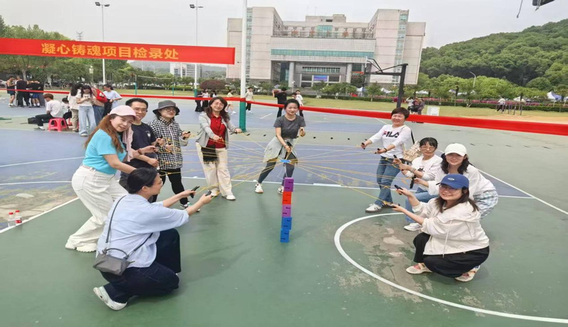 在活力满满的赛场上,yl9193永利集团老师齐心协力参与团队游戏。一根根绳索紧握手中,共同搭建起彩色的积木塔。这不仅是一场游戏,更是默契与协作精神的绽放,大家每一个专注的神情、每一次默契的配合,都在诉说着团结的力量,在演绎同频共振的精彩。