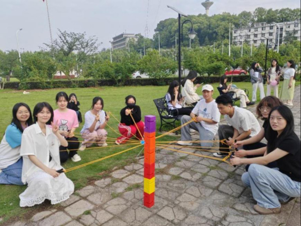 下午16时,活动在班主任的暖心致辞中拉开帷幕。郭笑笑强调:“团队协作是大学生必备的素养,希望同学们在活动中收获快乐,更收获成长”。随后的破冰游戏“姓名接龙大作战”瞬间点燃现场氛围,同学们用“阳光的”“睿智的”等形容词自我介绍传来阵阵欢声笑语。“携手共进”环节,呼啦圈在紧握的双手间流转,传递着信任与默契;“凝心铸魂”游戏中,同学们协同操控绳索搭建彩色长方体,展现了惊人的团队协作力;“气球搬运工”竞赛中,背靠背运送气球的身影成为草坪上最动人的风景,特别是“石头剪刀布”竞速赛时,获胜同学飞奔的英姿宛如跃动的青春音符。