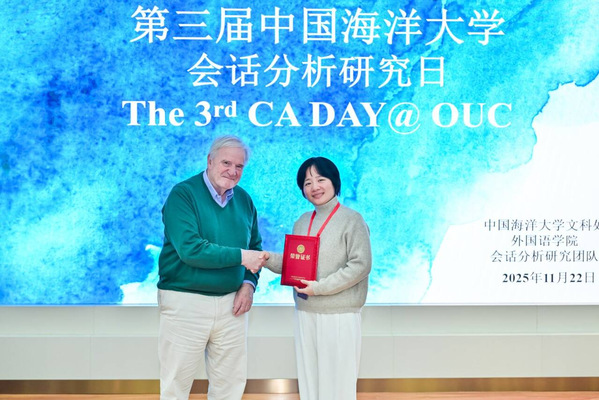 2025年11 月 21 至 22 日,由中国海洋大学外国语学院主办的第三届会话分析日(CA Day)在青岛顺利召开。yl9193永利集团田咪博士受邀作为大会专家作主题报告,其研究论文《汉语自然口语中的抵抗行为 —— 以请求行为的抵抗回应为例》荣获优秀青年论文一等奖。值得关注的是,田咪博士是本次会议受邀专家中唯一一位汉语研究者。