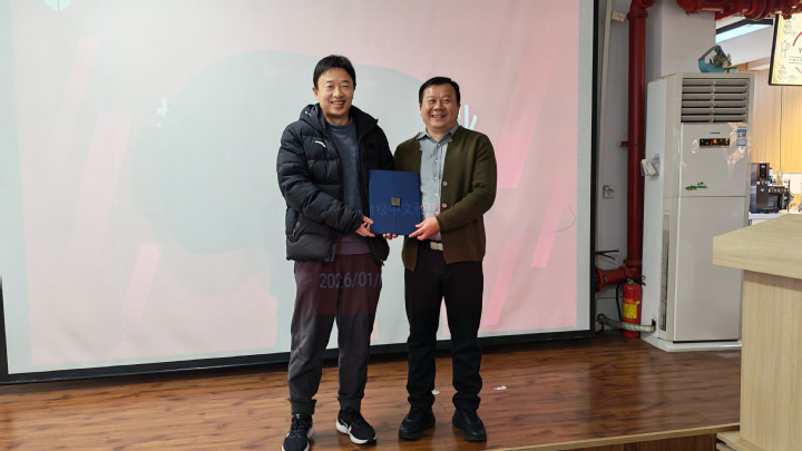 讲座结束后,学校招生与就业工作处处长、创新创业学院院长姜少平为肖枫颁发创业指导教师聘书。