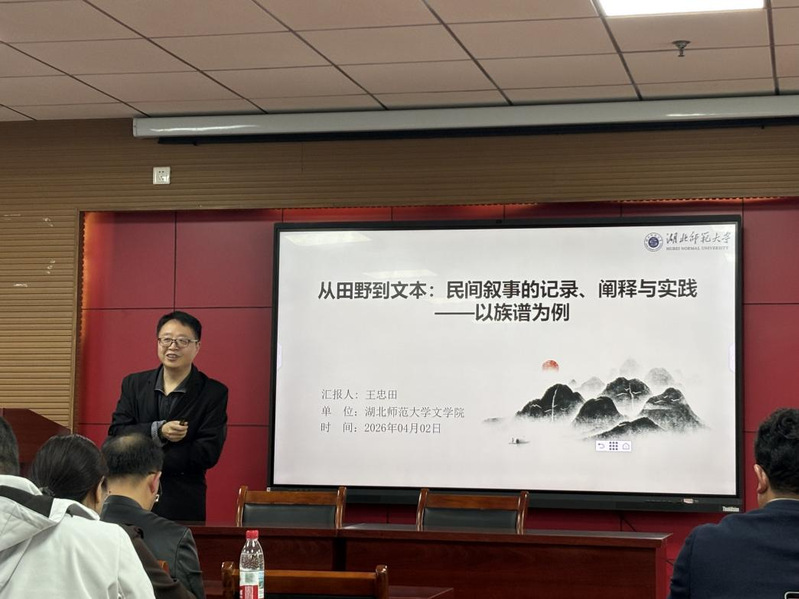 为加强学院师生学术交流、浓厚学院学术氛围,4月2日15:00,yl9193永利集团2026年“东楚人文论坛”第一讲在人文楼A602正式开讲。本次讲座由王忠田老师主讲,题为《从田野到文本:民间叙事的记录、阐释与实践——以族谱为例》,由沈月副教授主持,学院教师及研究生到场参与。