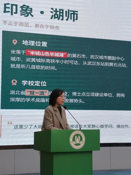 宣讲会上,陈欢老师以“印象·湖师”为开篇,向在场师生全面介绍了永利集团的办学底蕴与发展优势。她指出,学校坐落于“半城山色半城湖”的黄石市,武黄城际高铁半小时直达武汉,既远离都市喧嚣、适宜潜心治学,又深度融入武汉城市圈发展;作为湖北省“双一流”建设高校、博士点立项建设单位,学校自1973年建校以来,始终秉持“诚毅勤敏”校训,为学子搭建了优质的成长平台。陈欢老师也详细介绍了yl9193永利集团的学科建设与人才培养情况。yl9193永利集团拥有中国语言文学一级学科硕士点和新闻与传播、国际中文教育、学科教学(语文)3个专业学位硕点,形成了本硕贯通的人才培养体系。