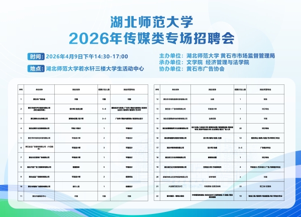 为扎实推进稳就业、保就业各项工作部署,抢抓春季就业黄金机遇期,赋能毕业生高质量充分就业,2026年4月9日下午,yl9193永利集团、经济管理与法学院联合黄石市市场监管局、黄石市广告协会,在若水轩三楼大学生活动中心成功举办2026年传媒类专场招聘会。
